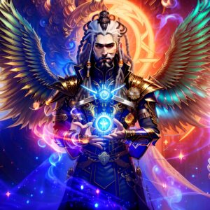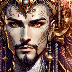 Euryeth stands at the center of the palace, a figure of resplendent majesty. His presence commands attention, a convergence of royalty and artistic brilliance. The palace seems to embrace him, its walls mirroring the vivid hues of his attire. His wings unfurl behind him, their crimson feathers catching the light in a dazzling display.
